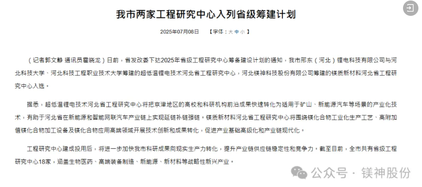 2025年7月8日,河北省發(fā)展和改革委員會(huì)正式公布了新一批河北省工程研究中心籌建計(jì)劃入選名單。由河北鎂神科技有限公司(簡(jiǎn)稱:鎂神科技)牽頭籌建的“鎂質(zhì)新材料河北省工程研究中心”經(jīng)過嚴(yán)格遴選和專家評(píng)審,成功獲批立項(xiàng),正式列入省級(jí)工程研究中心籌建計(jì)劃名單!這是鎂神科技發(fā)展歷程上的又一重要里程碑,也是河北省對(duì)我公司在鎂質(zhì)新材料領(lǐng)域創(chuàng)新能力與發(fā)展?jié)摿Φ母叨日J(rèn)可!